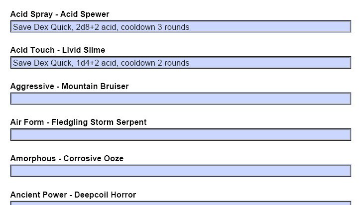 The workbook has 275 monster abilities so you can keep track of what you would like the ability to do. Just update fields to what you believe best works for your Open Dungeons world. Some are populated from this Monster Trove, but these are not absolute: some monsters may have these abilities, some may not - DN decision and to help minimize metagaming.