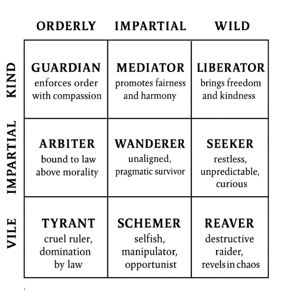 In Open Dungeons™, alignment does not apply to player characters. You have full agency to decide how your character thinks and acts in the world. No chart, grid, or label can dictate your choices - your character's morality and personality are entirely yours to roleplay.