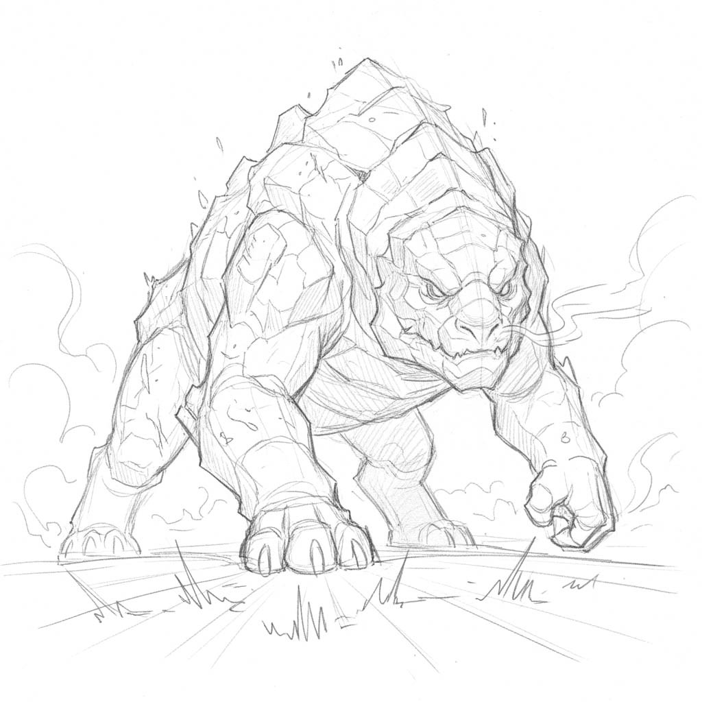 Old muscle on old bones, it hits like a boulder rolling downhill. Its hide is thick and stony, scarred from centuries of fights it somehow survived. The air hums with its slow breathing before it charges, each step shaking the ground like warning drums. It doesn't hunt for need, only habit - a relic of an age when everything alive was prey or rival. Eyes dull with time, but its instincts are flawless; it knows the sound of fear before it hears the scream.