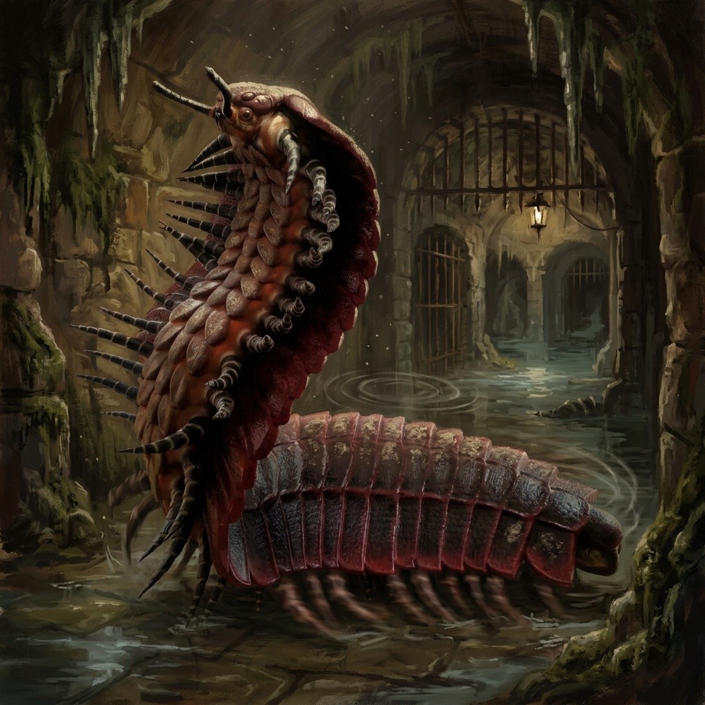 Eight feet of armored segments, moving with the low, deliberate certainty. The legs are the worst part - not the count, but the sound. A dry, rhythmic clicking on stone that you feel before you hear it. Territorial, not aggressive by default - it hunts when hungry, ignores the party if it has recently fed. A fed Arthropleura (roll d6 on entry: 1-2 fed, 3-6 hungry) will move away from torchlight unless cornered. A hungry one locks onto the nearest warm body. It does not retreat - no survival instinct for flight, only feeding. A dead Arthropleura yields approximately 40 lbs of chitin segments worth 15 GP to an armorer, and the mandibles worth 8 GP as exotic curiosities. Carrying either is cumbersome and smells of wet cave for days.