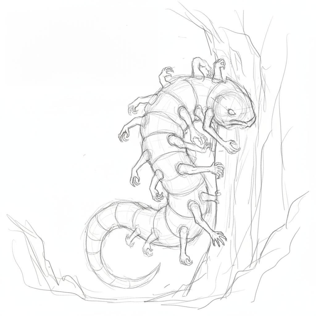 A two-tailed worm that sprouts stolen arms and skitters where light won't follow. The nightmarish predator defies natural order - a segmented, worm-like body bristling with humanoid arms grafted along its length like obscene decorations. The limbs aren't vestigial either; they grasp, pull, and pummel with disturbing coordination. It favors absolute darkness, retreating from torchlight.