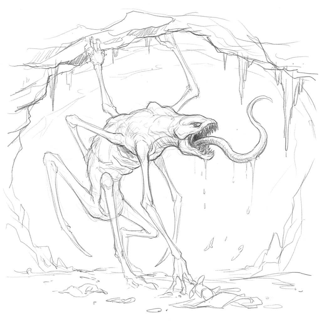 A pale, long-limbed scavenger that clings to stone like a spider. Its tongue lashes out like a wet rope, snaring the careless and hauling them up toward a yawning mouth ringed with bone. The Carrion Hunter feeds in silence, leaving only scraps and drag marks along the ceiling.
