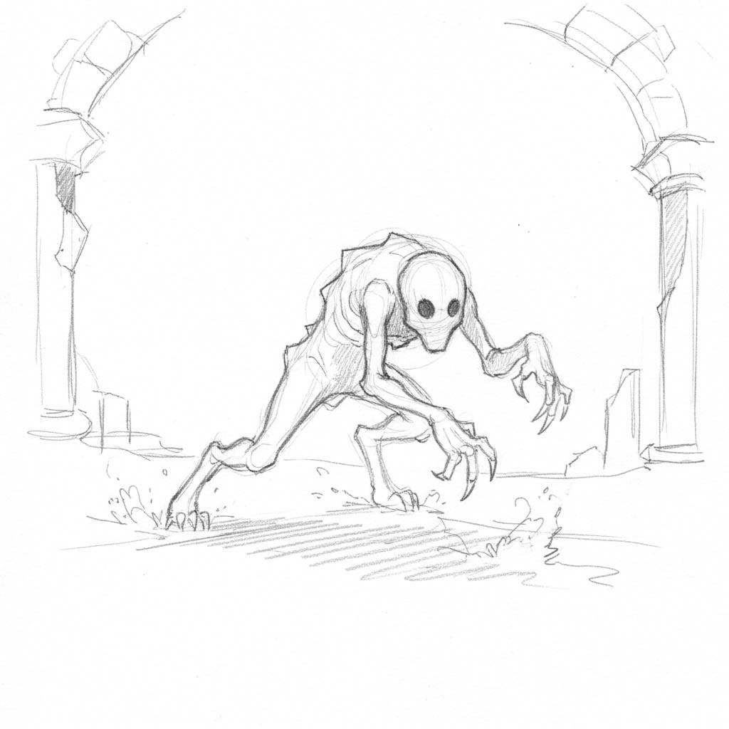 A small, ghost-pale creature that moves in sudden, deliberate bursts, its claws leaving chalky streaks where it walks. The air around it carries a grave chill that seeps into bones and slows reaction. Chalk Prowlers favor crypts and ruined halls, stalking from the edge of vision and striking when warmth or motion betrays life.