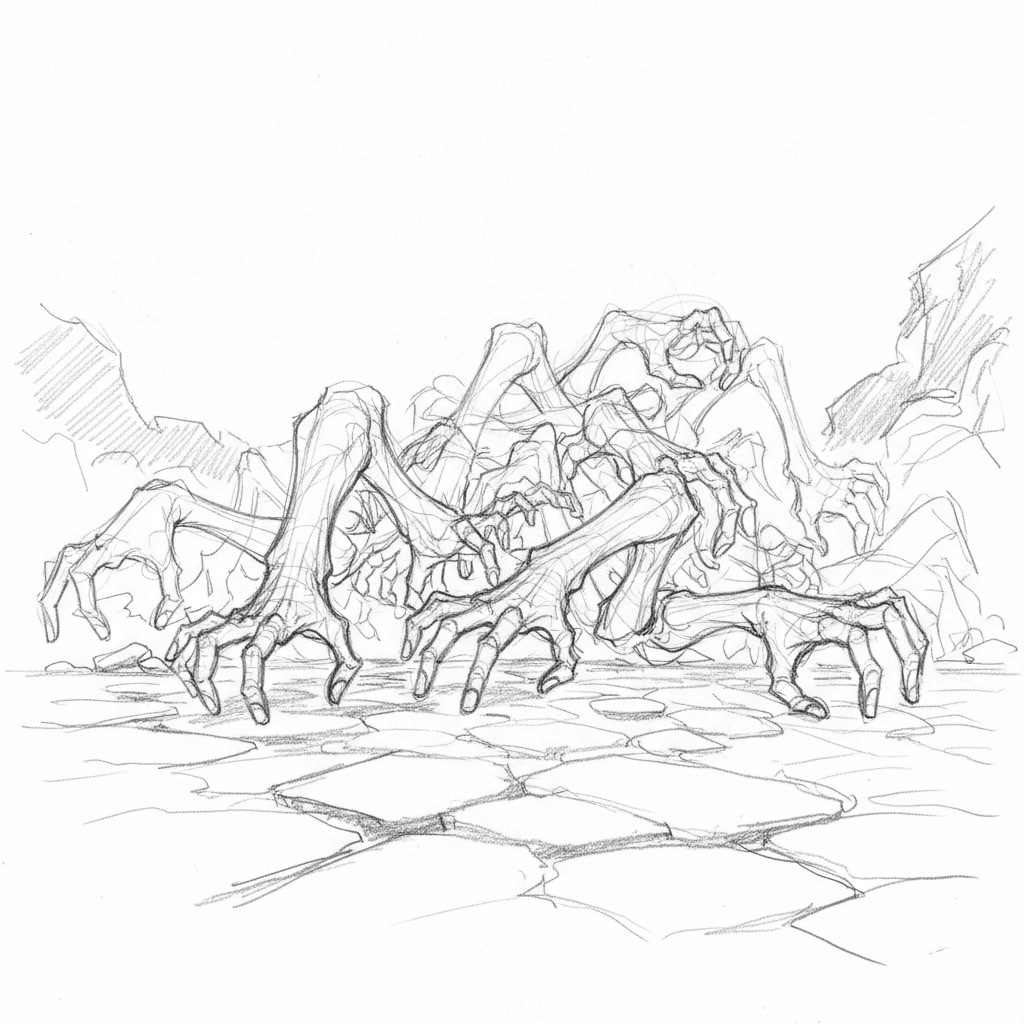 A writhing mass of severed hands skittering across the ground like grotesque spiders, their bony fingers clicking and scraping against stone. These undead abominations move with unsettling coordination, surging toward their prey in waves of grasping digits. When they catch someone, it's not just one or two hands - it's many of them, pulling and clawing from every direction. The sound alone is enough to unnerve most adventurers: that dry, rattling chorus of dead flesh dragging itself forward with singular purpose.