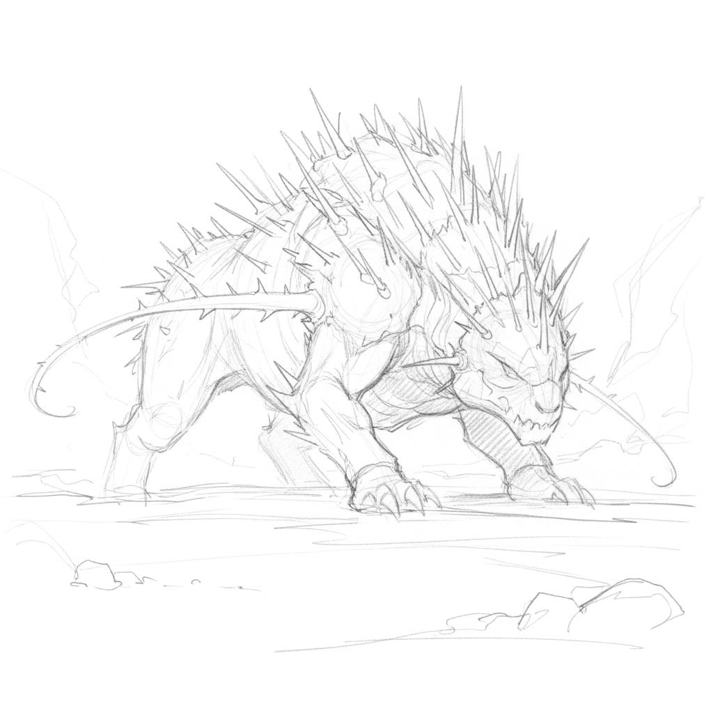 A low-slung predator covered in coarse, needle-sharp bristles that jut from thick hide like a forest of barbs. The creeper prowler moves with surprising stealth for something so heavily armored, its bulk deceptive until it charges. Getting close is a mistake - even a glancing blow leaves quills embedded in exposed skin, and a direct hit from its shoulder can knock a fighter flat. Long, whiplike thorns trail from its flanks, lashing out at anything that tries to flank or flee. After an encounter, adventurers spend hours pulling splinters from gear, each one a reminder of how much worse it could have been.