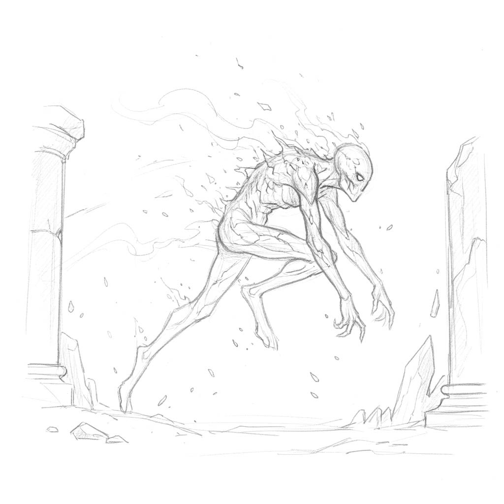 A hunched figure wreathed in smoke and embers, its cracked skin glowing like dying coals. The crypt leaper uses terrain to its advantage, darting between cover and launching itself across open ground in bursts of flame. Standing next to it means breathing hot ash and feeling skin blister from radiant heat. It picks a target and harasses them relentlessly, leaping away before anyone can retaliate, leaving trails of soot and scattered sparks.