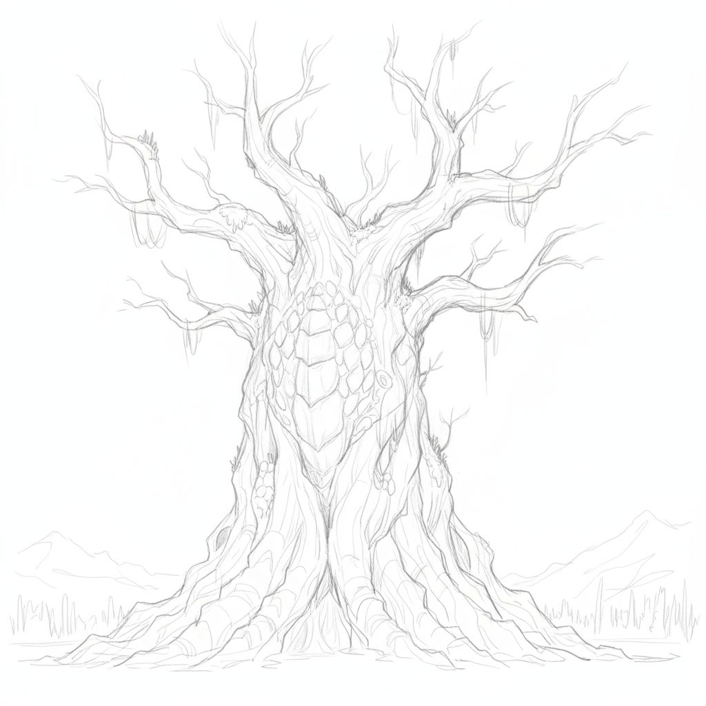 A towering giant with bark that shifts between wood grain and something reptilian, each ridge catching light like dragon scales. Thick branches twist overhead, their tips sharpened into wicked thorns that glow faintly with inner heat. The dragonroot doesn't move unless threatened, standing motionless for years as moss and vines try - and fail - to take hold on its surface. When provoked, branches whip forward with startling speed, trailing embers and leaving scorch marks across stone and earth. The air around it shimmers with residual heat, and anything foolish enough to strike its trunk finds their weapon smoking, the bark too hot to touch for long.