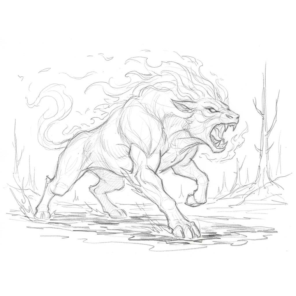 Fire-dwelling beasts covered in burning fur, their presence makes the air shimmer with heat. Their roars sound like rolling flames, and when they charge, the ground scorches beneath them. They live in lava plains and burned-out forests, feeding on anything that can still move through the heat.
