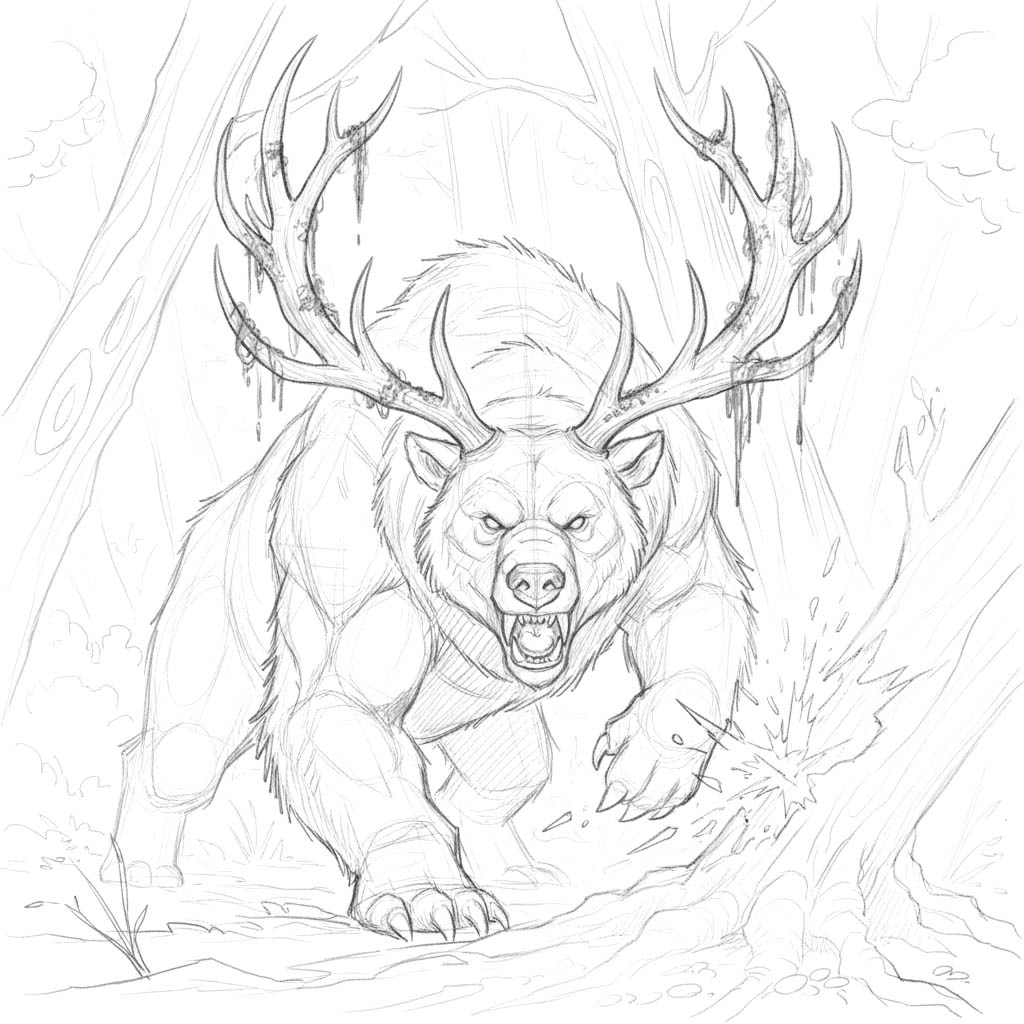 Beasts resembling bears crossed with elk, their bark-colored fur and mossy hides blend seamlessly with forest terrain. They are territorial and powerful, defending their woodland homes with crushing charges that can shatter tree trunks. The air grows still before one attacks, as if the forest itself holds its breath.