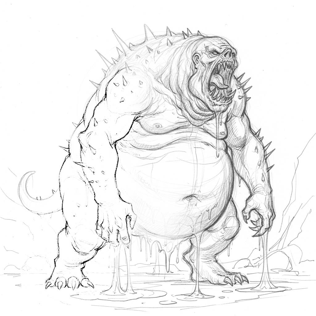 Bloated devil custodians that patrol infernal sewers and battlefields, their corrosive slime and venomous spines make them dangerous to approach. These guardians can swallow prey whole and digest them in their acid-filled abdomens.