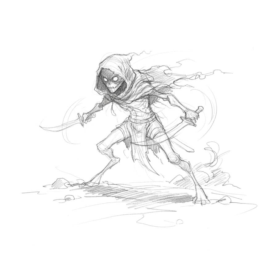 Small, wiry humanoids cloaked in tattered dark fabric, their eyes gleam with cunning malice from beneath deep hoods. These patient raiders favor ambush tactics over direct confrontation, slipping between shadows to strike at the wounded and overconfident. Their dual-wielded blades whisper through the air as they dance away from retaliation, always seeking the next shadow to vanish into.